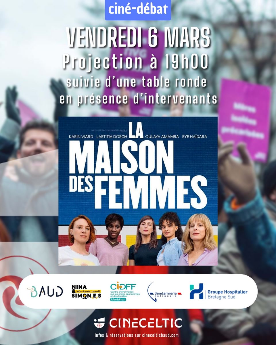 Le06marsà 19:00 Campagne Nationale Ciné-DébatLa Maison des femmes /santé ou HDJVIF participe à une table ronde au cinéma de Baud le vendredi 06.03 à l'occasion de la journée du 8 mars, journée internationale des droits des femmes. Informations annexes au site Boîte à OutilsImprimer cette pageEnregistrer la page au format PDF (maximum 1,5 Méga-octets) Partager cette page FacebookTwitterLinkedIn PrécédentDéfilé solidaire - Quand Mars Bleu rencontre Octobre RoseRetour à la listeJournée du SommeilSuivant